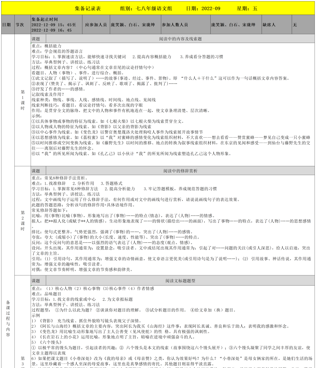 七、八年級語文備課組對“閱讀文的內(nèi)容及線索題、修辭賞析、標(biāo)題題型、寫作手法”展開了交流研討。