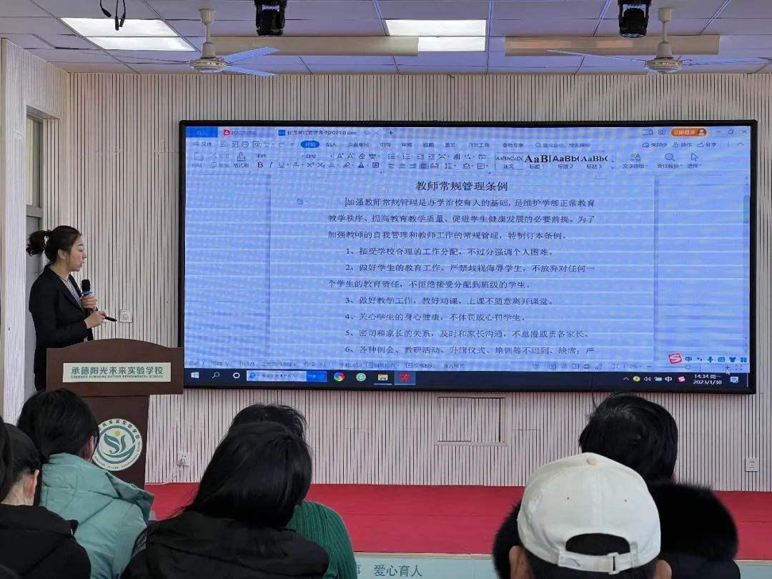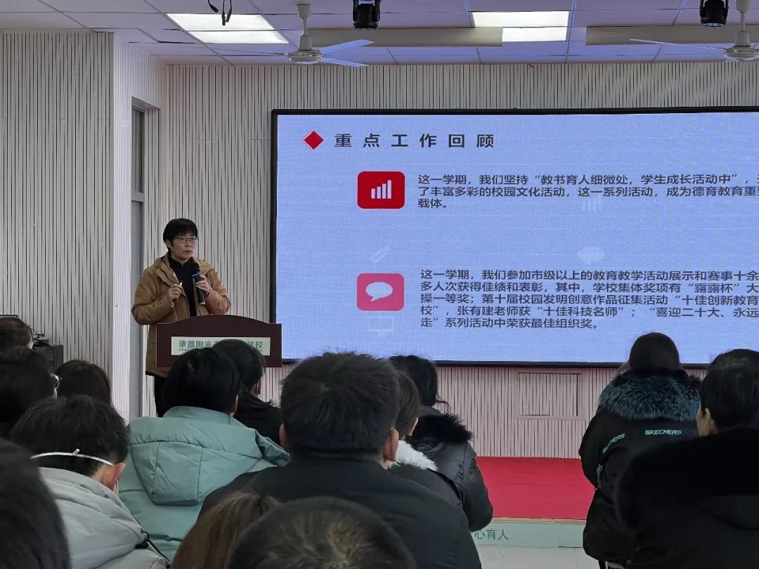四季初始,二月的風(fēng)正吹向春天,此時萬物生長,正是人間好時節(jié)。 為促進(jìn)師德師風(fēng)建設(shè),提升專業(yè)技能,強(qiáng)化學(xué)校管理,1月30日上午,我校全體教職工齊聚行知報(bào)告廳,開始了2022-2023學(xué)年春季教師培訓(xùn)會。 “穩(wěn)中提升” 王麗華校長首先對上學(xué)期重點(diǎn)工作進(jìn)行回顧。指出目前校區(qū)存在的問題,提出“穩(wěn)中提升”的工作目標(biāo),并強(qiáng)調(diào)下學(xué)期各部門的工作重點(diǎn)。