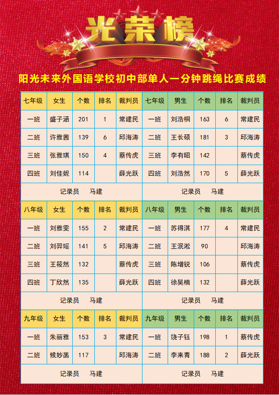 我們一起來看看同學(xué)們在短短的幾天訓(xùn)練之后的戰(zhàn)績吧!相信一個(gè)月后的比賽一定會更加精彩,學(xué)生們的成績一定會更加卓越! 八字跳繩賽