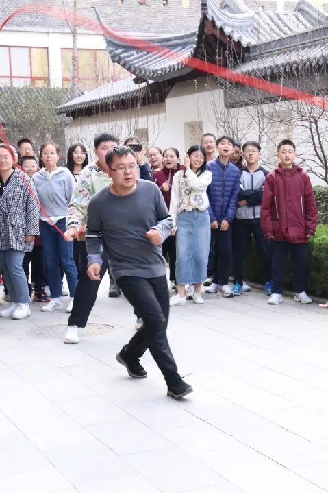 在裁判長的一聲“開始”令下,比賽開始了。老師們爭分奪秒地開始跳了起來,年輕教師活力充沛,中年教師也不甘落后。褪去課堂上嚴(yán)師的形象,走下講臺來到跳繩比賽場上,老師們各顯“繩”通。只見他們一個(gè)個(gè)使出渾身的解數(shù),緊握跳繩,繩子飛快地越過頭頂,在空中飛舞,此起彼伏。老師們隨著繩子的起落輕盈跳躍,笑聲與汗水一同揮灑,整個(gè)比賽現(xiàn)場成為了一片歡騰的海洋。