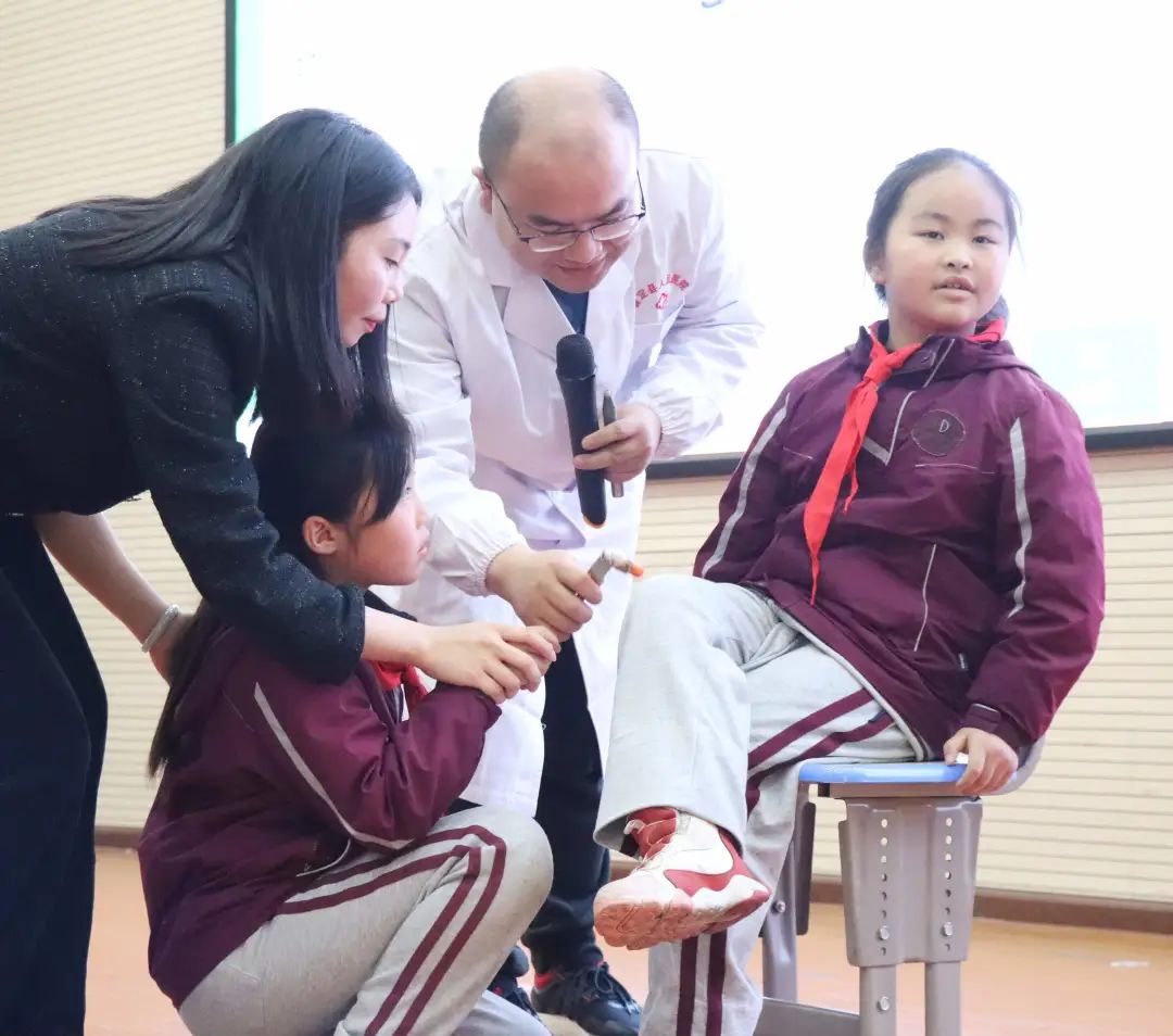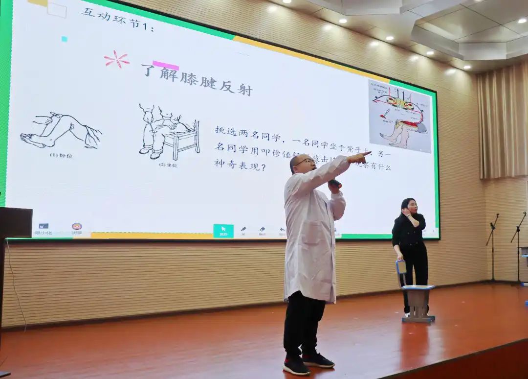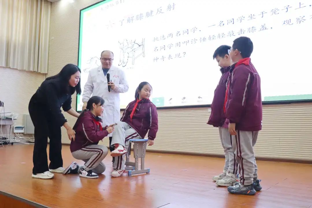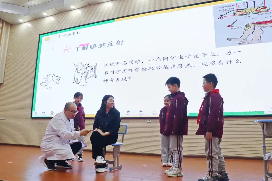 我們身體的每個(gè)部位都有其存在的意義,蔣醫(yī)生邀請了兩組同學(xué)上臺進(jìn)行膝腱反射實(shí)驗(yàn),一名同學(xué)坐于凳子上,另一名同學(xué)用叩診錘輕輕敲擊膝蓋,觀察有什么神奇表現(xiàn)。 試驗(yàn)后,孩子們感嘆道,原來自己身體的每一個(gè)部位都如此重要,它們相互牽連,相互作用,時(shí)刻帶動(dòng)著自己的身體運(yùn)動(dòng)著。