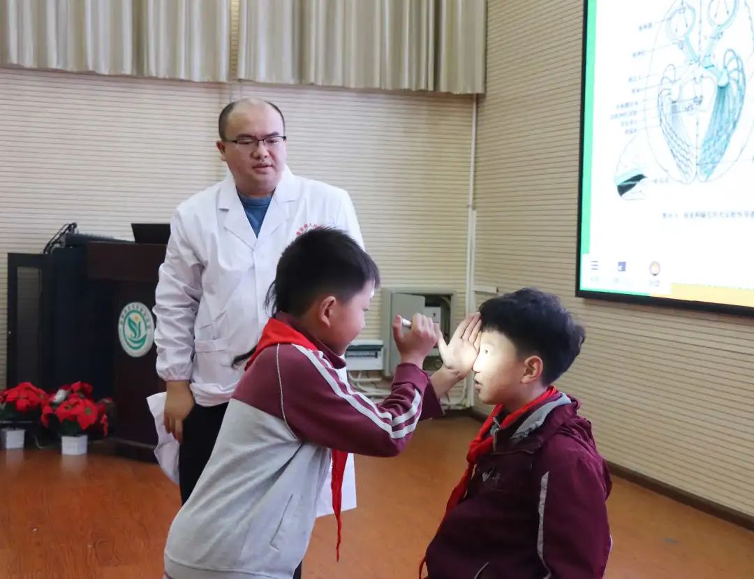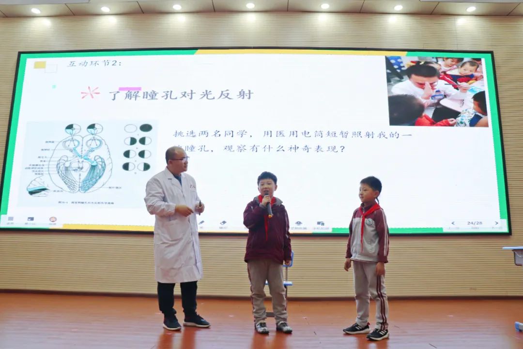 你知道嗎?健康的人眼受到光線刺激后瞳孔會(huì)立即縮小,移開光源后瞳孔迅速復(fù)原。若瞳孔對光反射異常,可能是昏迷顱腦外傷,腦出血,腦腫瘤等因素產(chǎn)生。 帶著對于眼睛的好奇心,孩子們積極舉手互動(dòng)上臺進(jìn)行瞳孔對光反射實(shí)驗(yàn),在蔣醫(yī)生專業(yè)指導(dǎo)下,一名同學(xué)用醫(yī)用電筒短暫照射另一名同學(xué)的一邊瞳孔并觀察。 觀察后兩名同學(xué)分別描述出自己看到的瞳孔變化,感受到了實(shí)驗(yàn)的神奇,自己的眼睛原來如此敏感脆弱,我們更要愛護(hù)自己的眼睛,保護(hù)雙眼不受傷害。