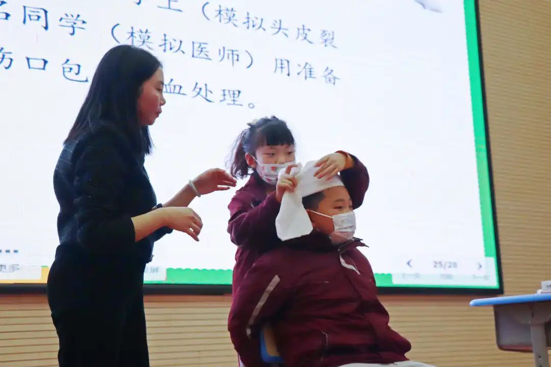 繃帶包扎是外傷現(xiàn)場應(yīng)急處理的重要措施之一。及時(shí)正確的包扎,可以達(dá)到壓迫止血、減少感染、保護(hù)傷口、減少疼痛等目的。 蔣醫(yī)生在桌子上準(zhǔn)備了幾樣止血包扎的醫(yī)療用品,模擬受傷場景,學(xué)生自行挑選一件進(jìn)行操作,教師指導(dǎo)。隨后蔣醫(yī)生進(jìn)行完整的止血包扎正確流程并提示注意事項(xiàng)。
