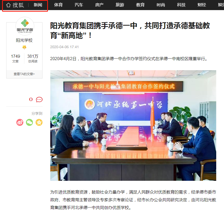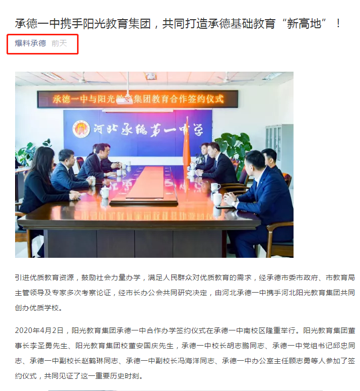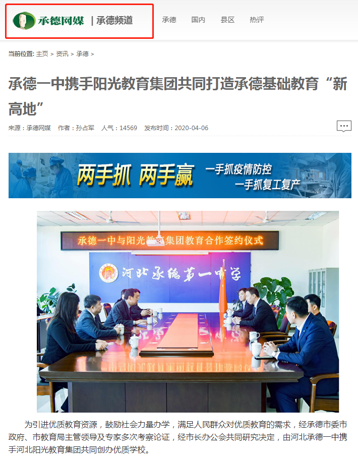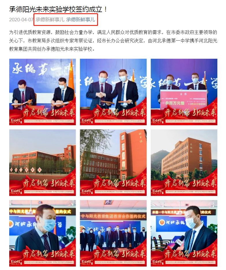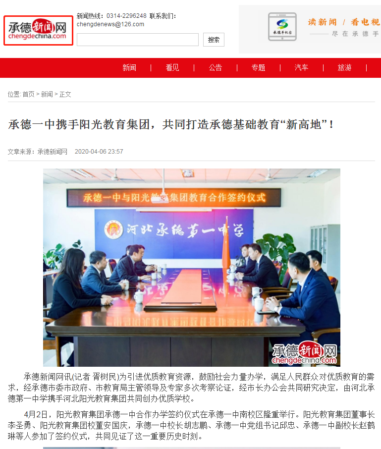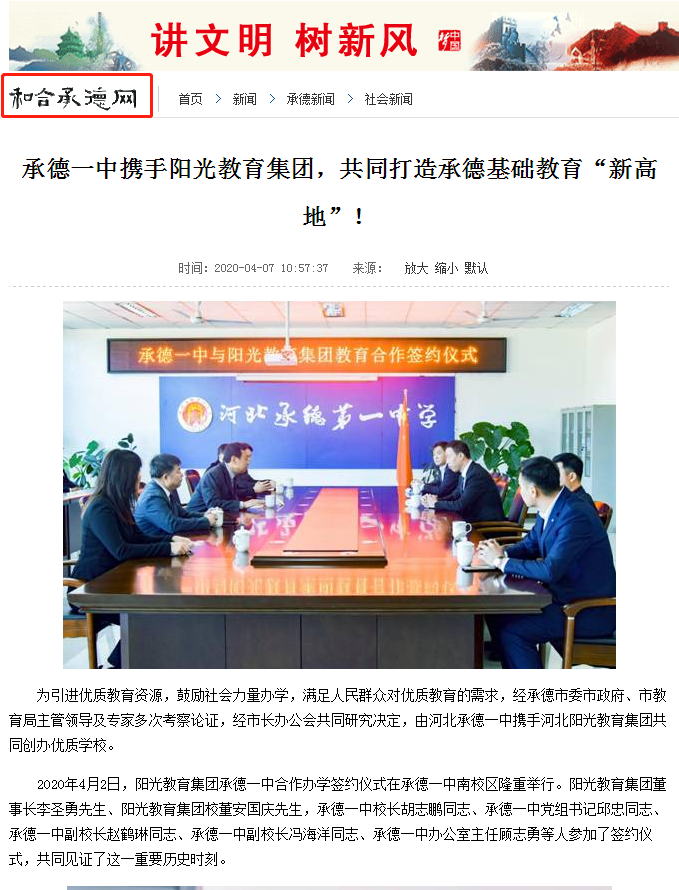 2020年4月2日,陽(yáng)光教育集團(tuán)&承德一中聯(lián)合辦學(xué)簽約儀式圓滿落幕。省會(huì)優(yōu)質(zhì)資源落戶承德,攜手河北承德第一中學(xué)共同打造高端優(yōu)質(zhì)基礎(chǔ)教育名校——承德陽(yáng)光未來(lái)實(shí)驗(yàn)學(xué)校。