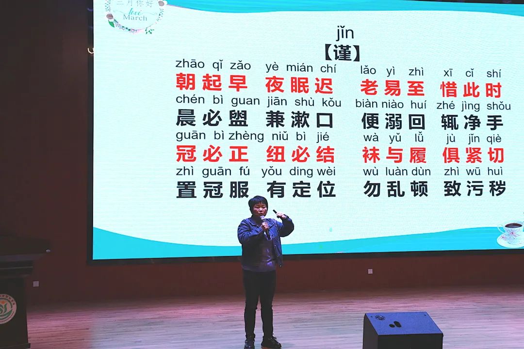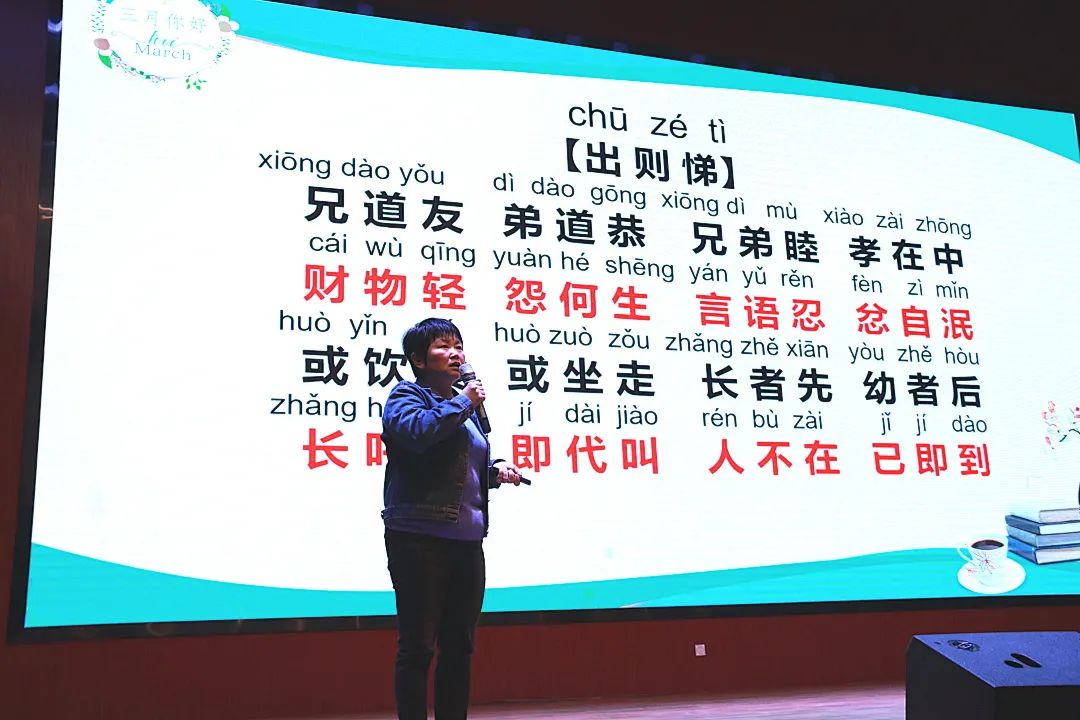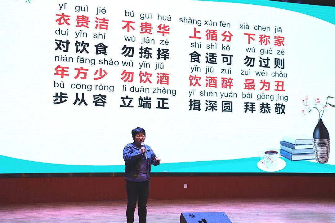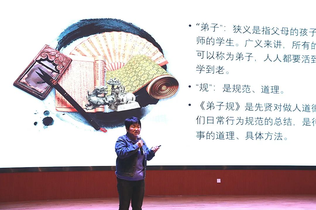 《弟子規(guī)》原名《訓蒙文》,為清初康熙年間山西絳州人李毓秀編寫的三言韻文。它是依據(jù)孔子教誨編成的學童生活規(guī)范,其內(nèi)容采用《論語》“學而篇”第六條:“弟子入則孝,出則悌,謹而信,泛愛眾而親仁。行有余力,則以學文”的文義,以三字一句、兩句一韻編撰而成。核心思想是儒家的孝悌仁愛?!兜茏右?guī)》列述了弟子在家、出外、待人、接物與學習上應當恪守的守則規(guī)范。系統(tǒng)地闡釋了中華民族的傳統(tǒng)美德,精辟地闡明了人們在日常生活中的道德準則,適合各年齡階段的人作為終身修身養(yǎng)性的經(jīng)典。 致敬國學經(jīng)典 打造書香校園 為進一步加強學校的德育工作建設,豐富孩子們的學習生活,加強優(yōu)良傳統(tǒng)文化的學習和文明禮儀教育,我校初中部特邀請初中語文資深教師,家庭教育高級講師,初中部語文學科主任尹老師給初中部的同學們進行了一場傳統(tǒng)文化洗禮。培訓的主題是《致敬國學經(jīng)典,打造書香校園》。