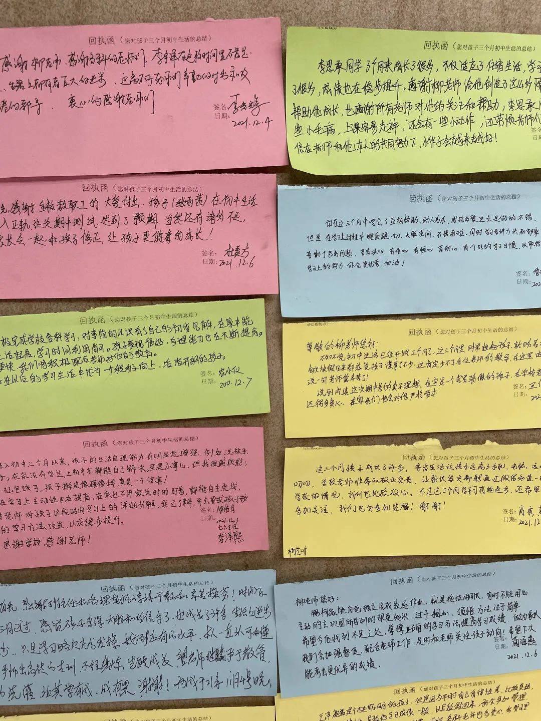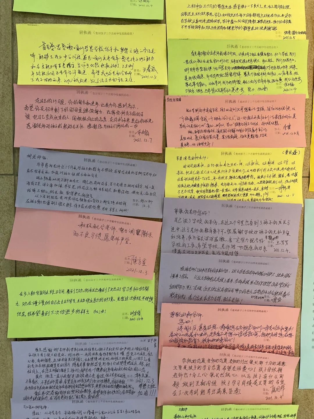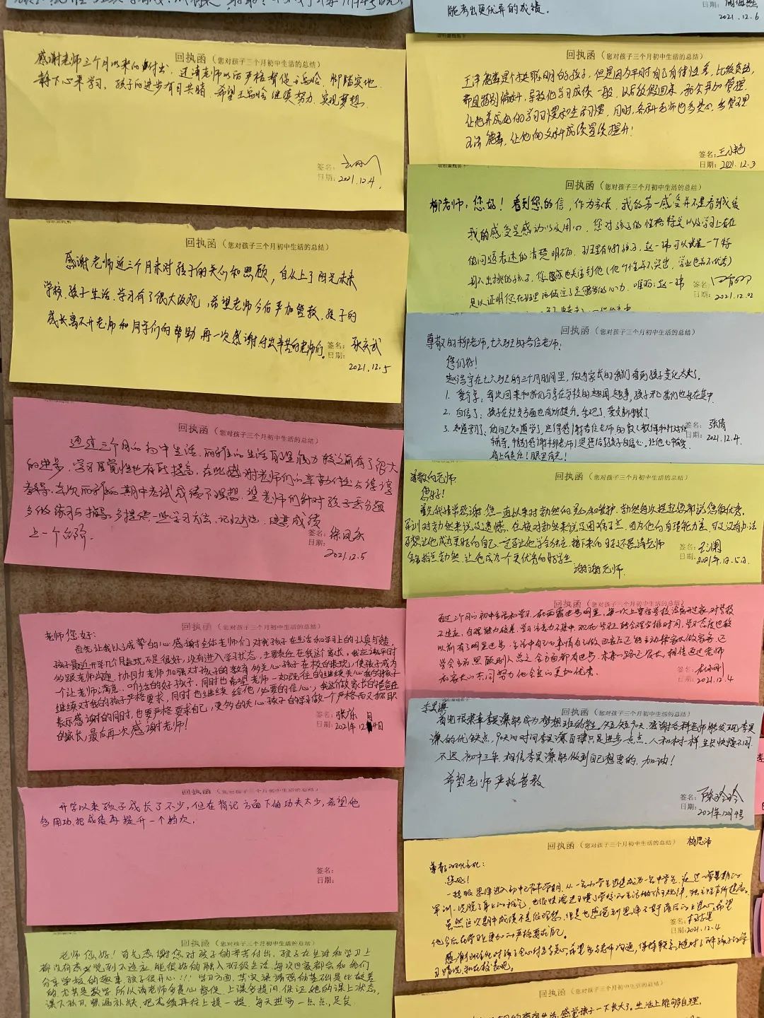 班主任將每個孩子的成績都呈現(xiàn)在了這封信里,還提出了孩子的優(yōu)點和短板,您把孩子放在哲恩我們就會全力以赴教學嚴要求,生活慈對待,讓他們成為心里有愛肩上有責任,眼里有希望,腳下有力量的可持續(xù)發(fā)展的更好的自己! 家長回執(zhí)函