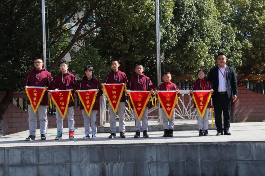 任明貴主任為文明宿舍頒獎。 全體師生呼喊校訓(xùn)