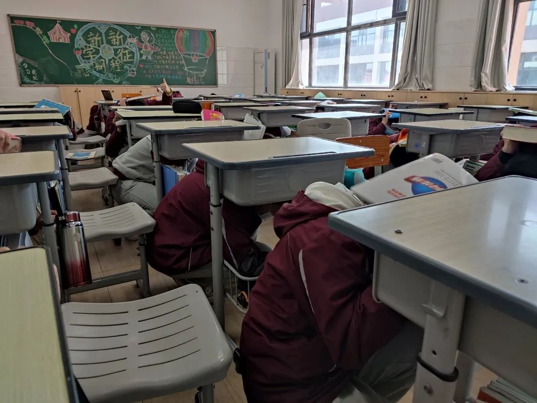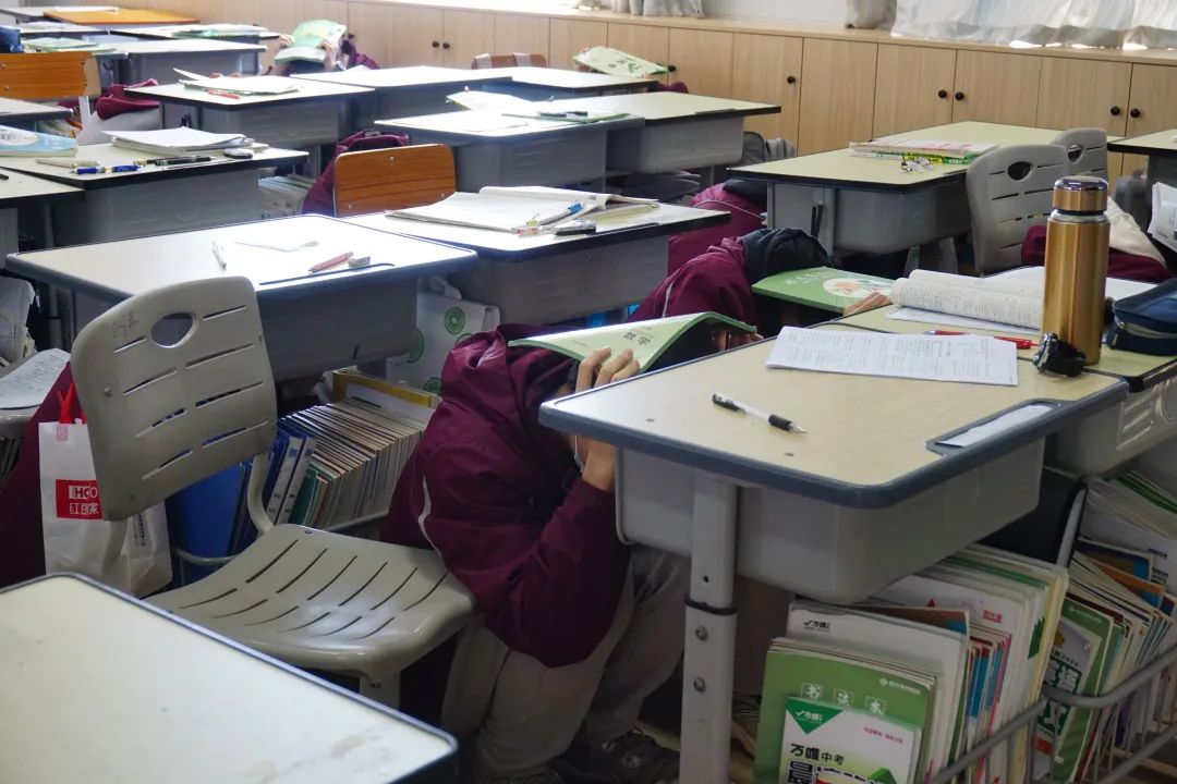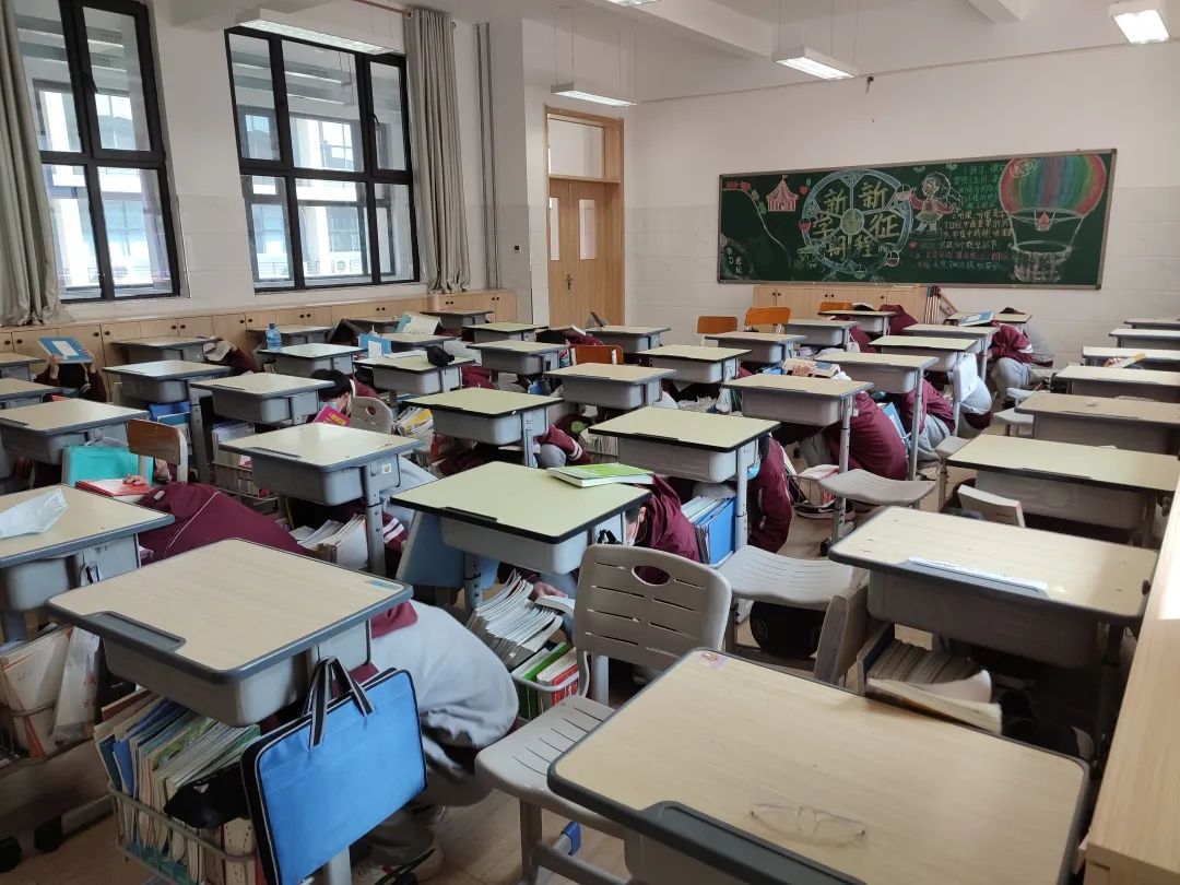 學(xué)生們迅速反應(yīng),躲在書桌下,用書本或手臂護住頭部,盡量蜷曲身體,用降低身體重心的姿勢蹲在書桌下。