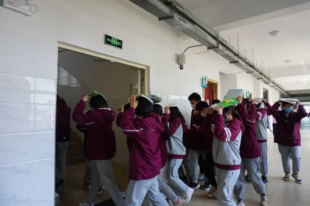 地震警報解除之后,學(xué)生們在老師的指揮下安全有序地撤離到操場空曠處蹲下,用手擋住頭部,防止被飛來的物品砸傷。