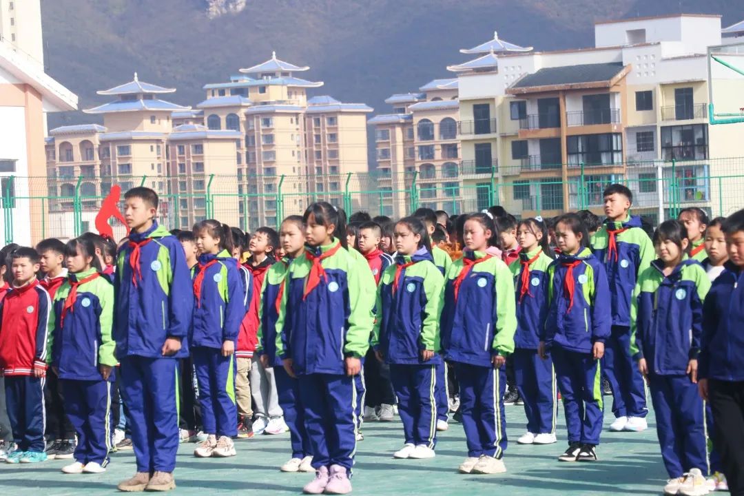 當(dāng)雄壯的《義勇軍進(jìn)行曲》響徹整個(gè)校園時(shí),升旗手把鮮艷的五星紅旗緩緩升起,全體少先隊(duì)員敬隊(duì)禮,師生行注目禮。