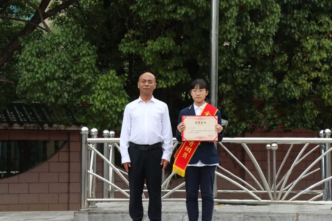 段海春校長為區(qū)級優(yōu)秀共青團員1102班葉祖榮同學(xué)頒發(fā)證書、紀念冊。