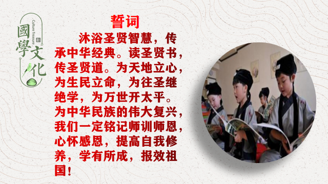 師生共讀誓詞,同學們朗朗的讀書聲響徹整個會場,沐浴圣賢智慧,傳承中華經(jīng)典。讀圣賢書,傳圣賢道。為天地立心,為生民立命,為往圣繼絕學,為萬世開太平。為中華民族的偉大復興,我們一定銘記師訓師恩,心懷感恩,提高自我修養(yǎng),學有所成,報效祖國!也表達了同學們對傳承和發(fā)揚國學經(jīng)典的堅定信念和信心。 《弟子規(guī)》博大精深,在人生觀、價值觀方面提出了許多真知灼見,至今對我們?nèi)杂猩钸h影響。尤其是對于我們當代中學生的人格教育來說,其意義重大。《弟子規(guī)》集古人圣賢們的智慧為一身,也是學生和家長們可以讀誦的優(yōu)秀經(jīng)典。在日常中能夠達到知行合一,規(guī)范自己,在迷茫的的時候能夠開導自己,可以給同學們和家庭、成長、生活在各個方面帶來啟發(fā)。同時其中的優(yōu)秀詩篇也是需要我們繼續(xù)傳承和發(fā)揚的優(yōu)秀的國學文化!