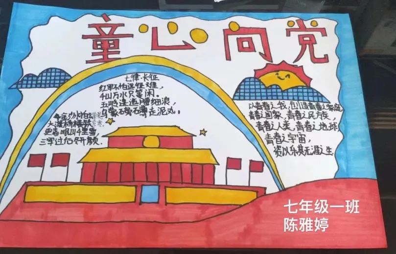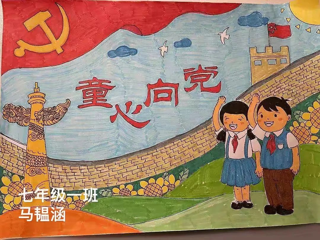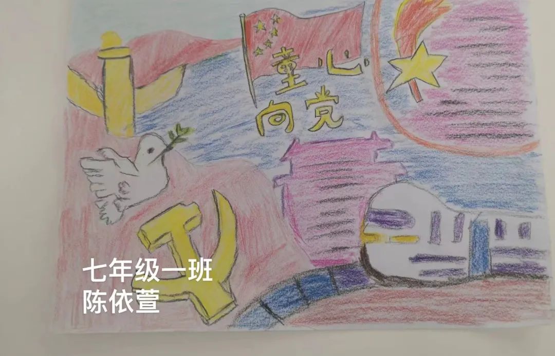 七年級(jí)(6)班 當(dāng)一段段紅色記憶走進(jìn)孩子們的心中 那份身為中華兒女的自豪感油然而生 七年級(jí)的孩子們用稚嫩的畫筆 表達(dá)對(duì)黨的崇敬和熱愛 |