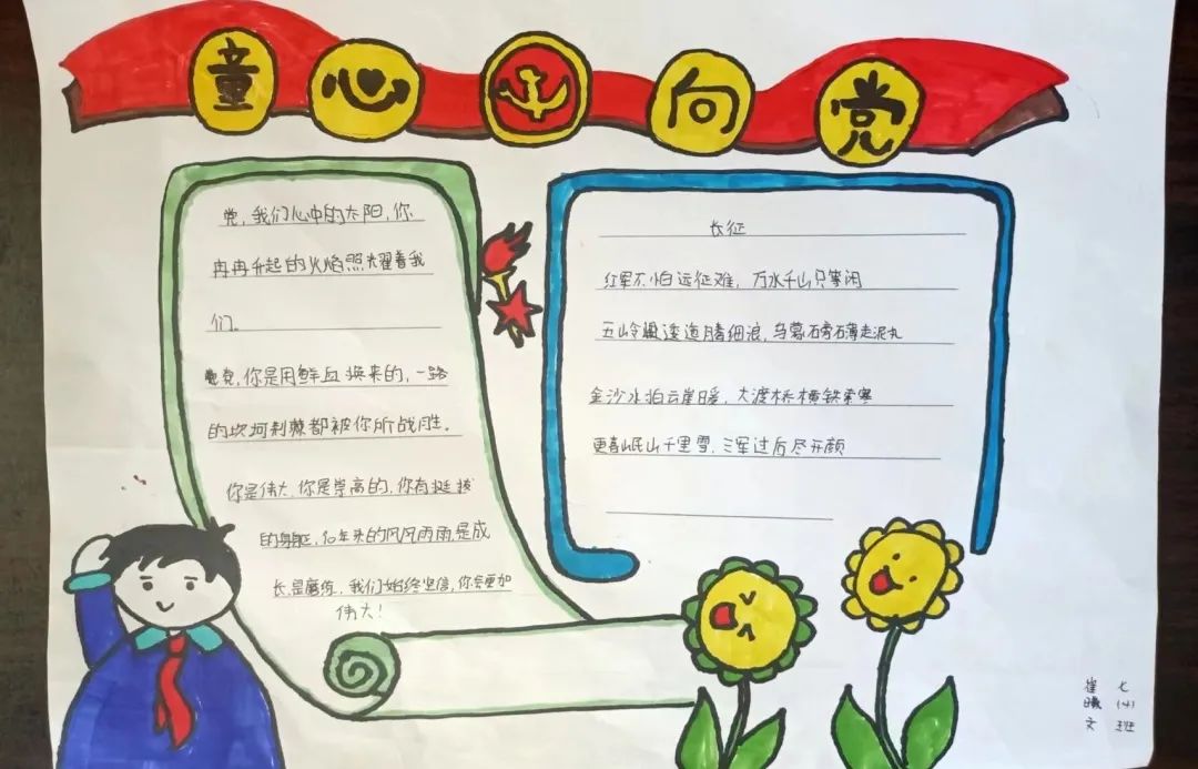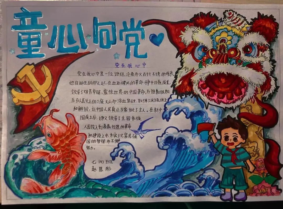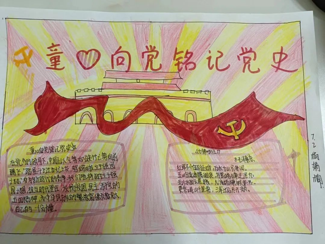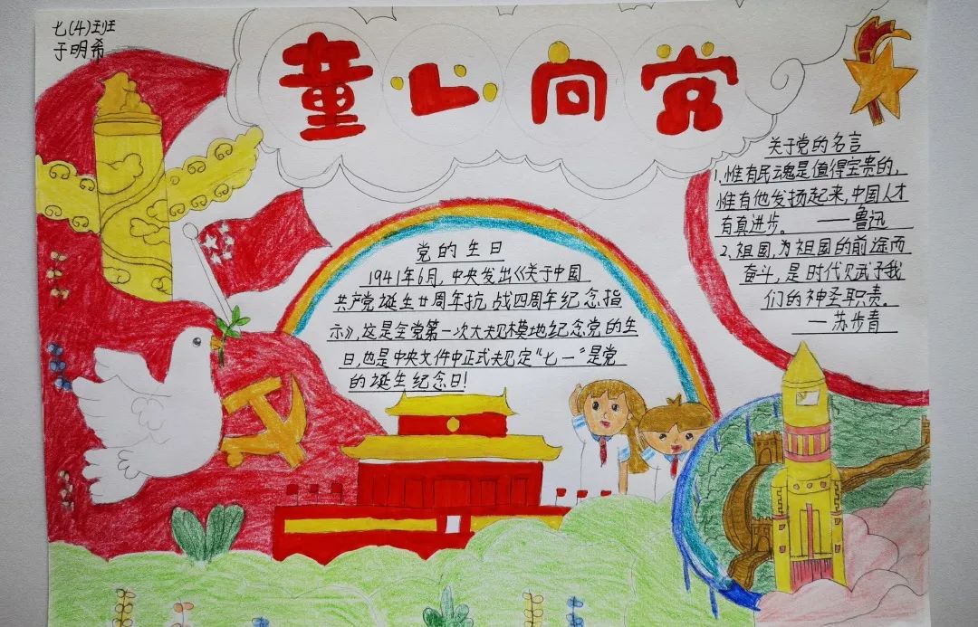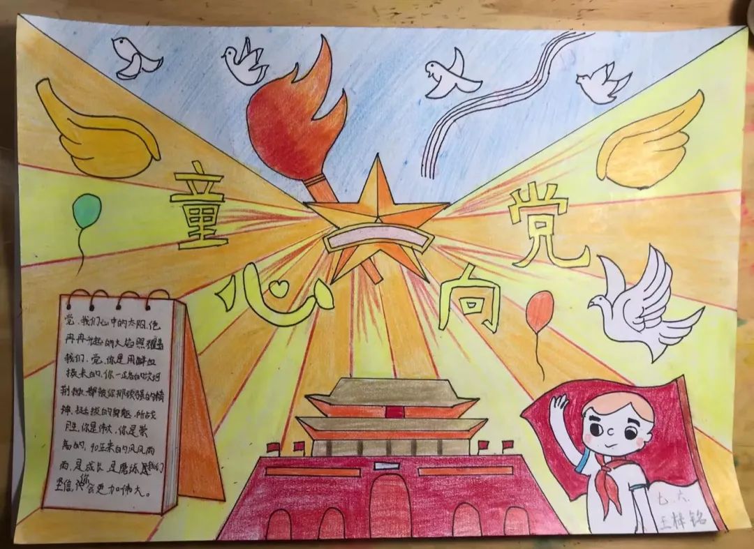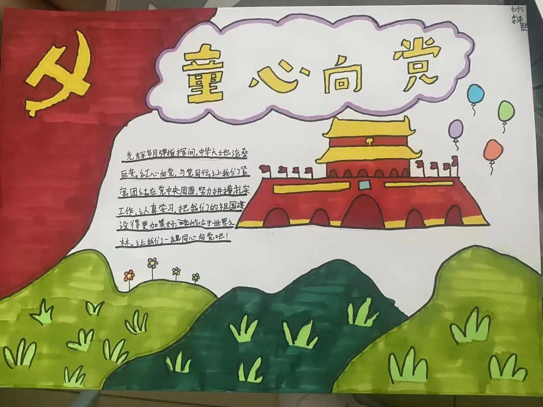 我們作為青少年兒童應(yīng)該一心向黨,將黨放在心中,就像梁?jiǎn)⒊壬f(shuō)的那樣 “少年強(qiáng)則國(guó)強(qiáng),少年雄于地球,則國(guó)雄于地球”我們就是國(guó)家的未來(lái)國(guó)家的希望。 讓我們一起來(lái)欣賞孩子們的作品吧!