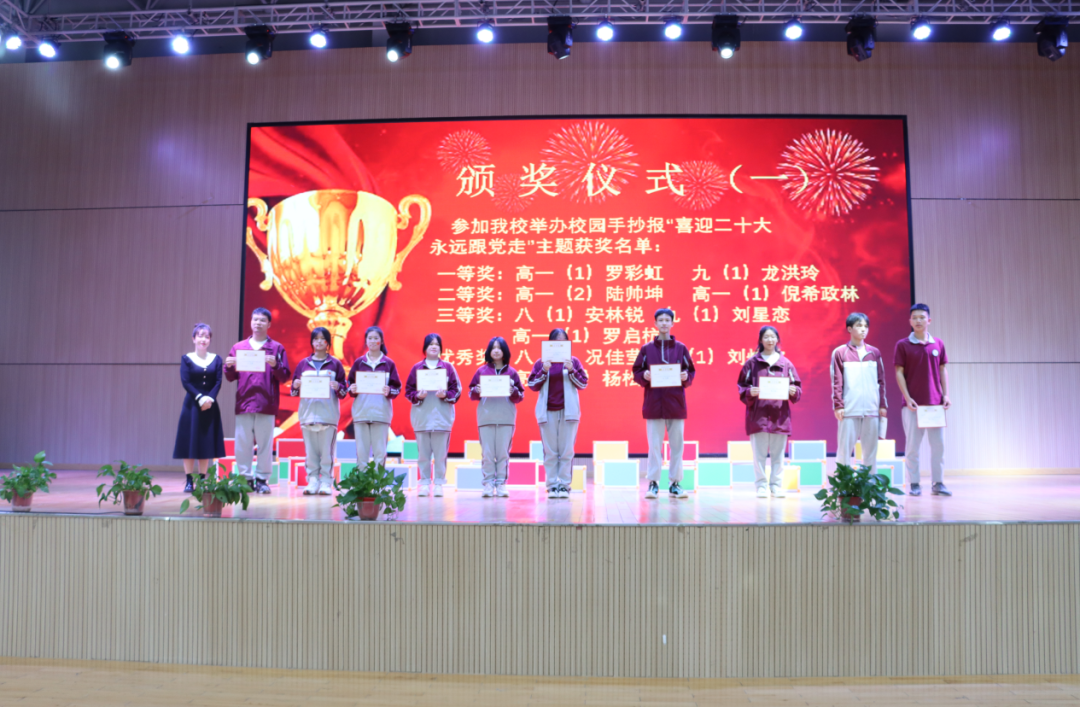 Δ“喜迎二十大 ·永遠(yuǎn)跟黨走”紅歌比賽中學(xué)組 一等獎 高一(2)班 二等獎 高一(1)班 三等獎 九(3)班 優(yōu)秀獎 七(1)班、七(2)班、八(1)班 九(1)班、九(2)班